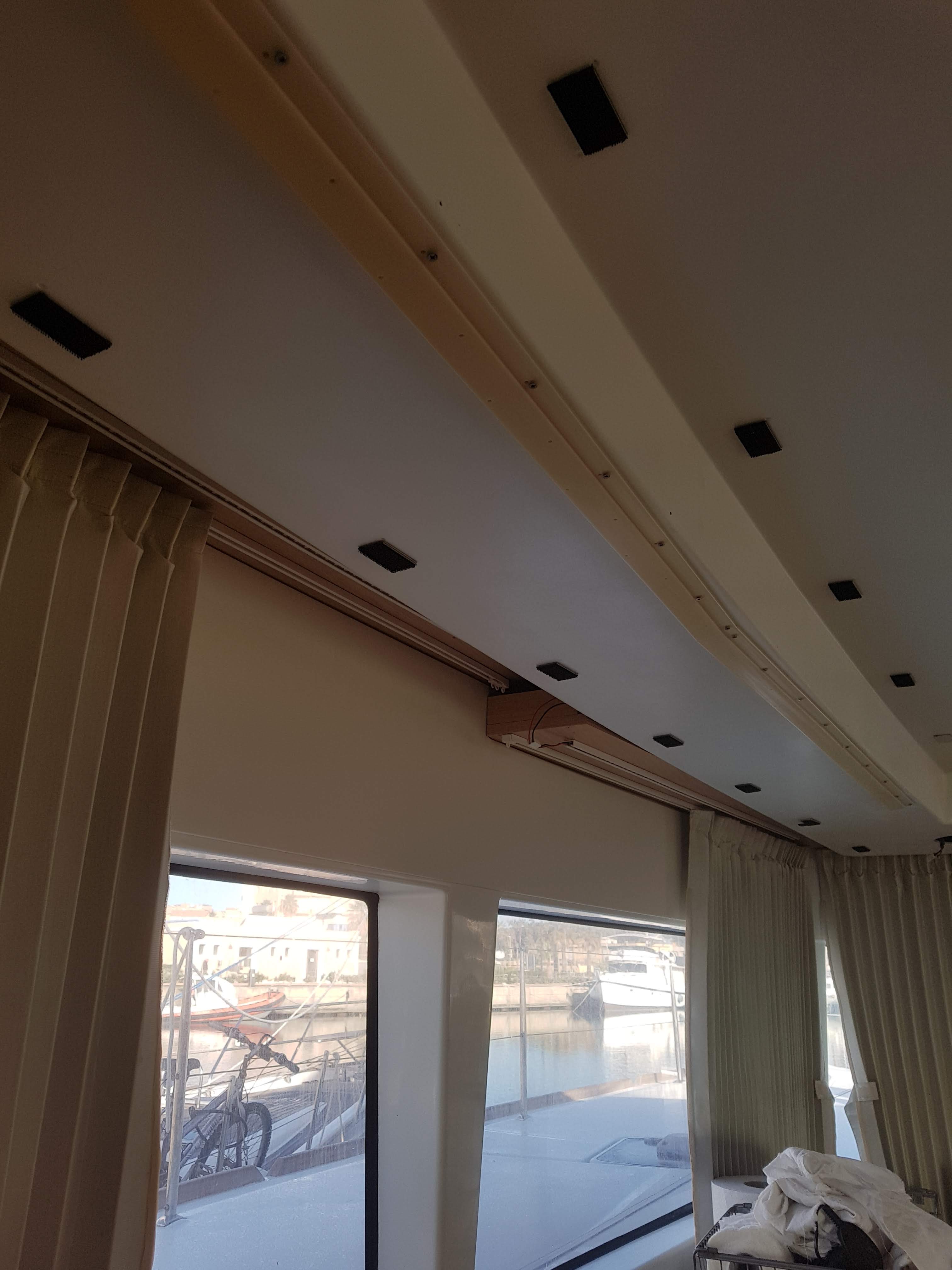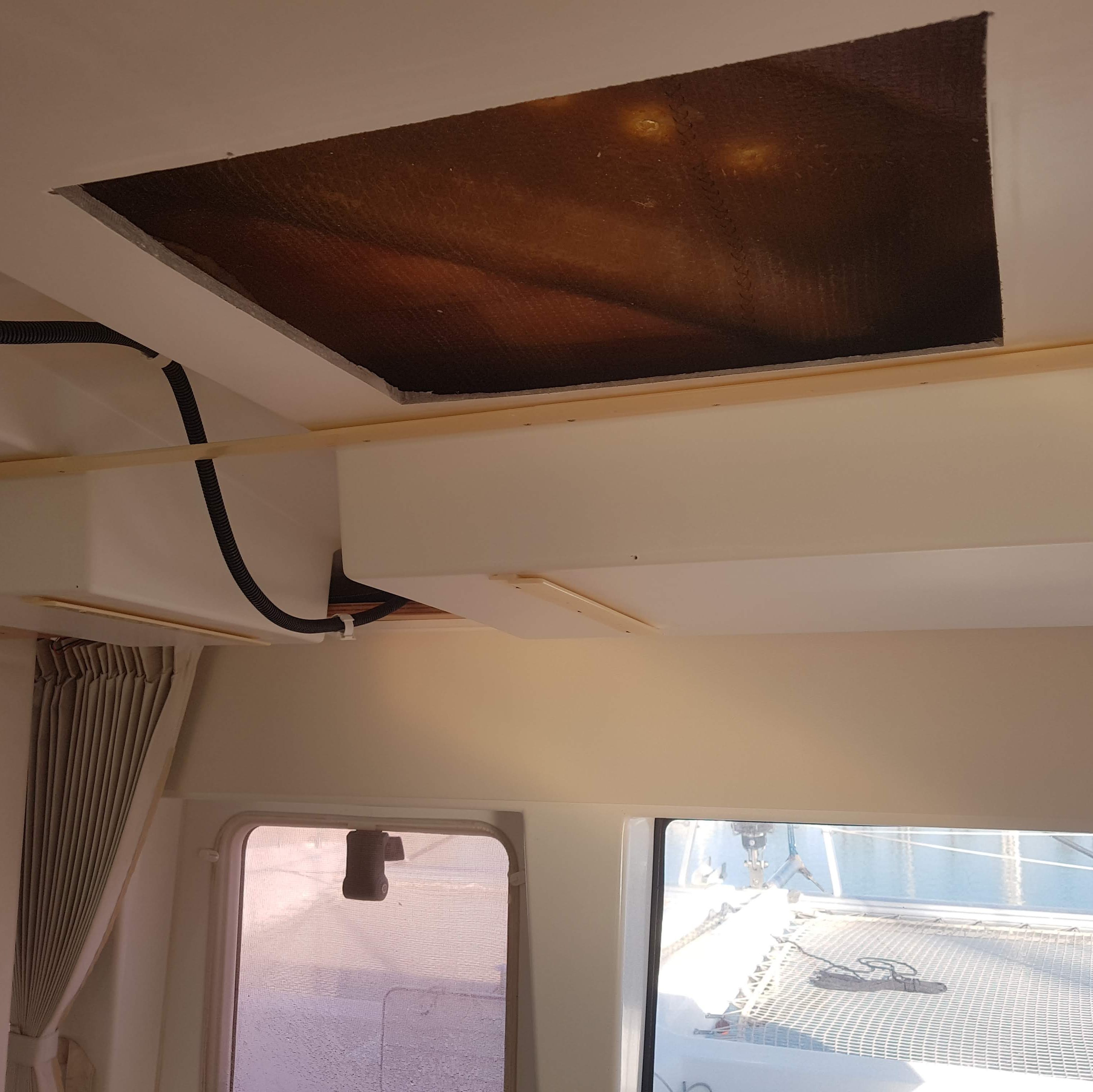We soon realized that accessing the bolts of the coach-roof deck organizer would imply dismounting all the ceiling parts of this Lagoon 450F. This task alone required three hours, being very careful not to dent the various pieces in the process, dismounting first the ceiling-attached Bose speakers.