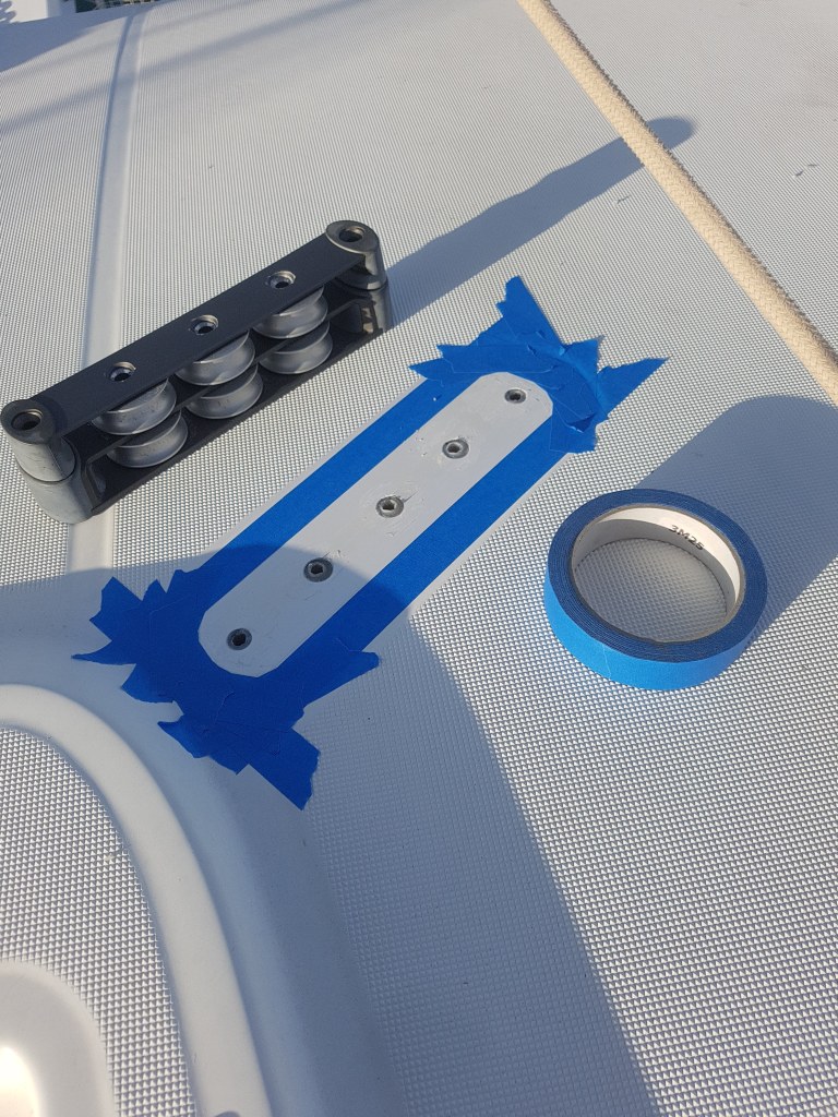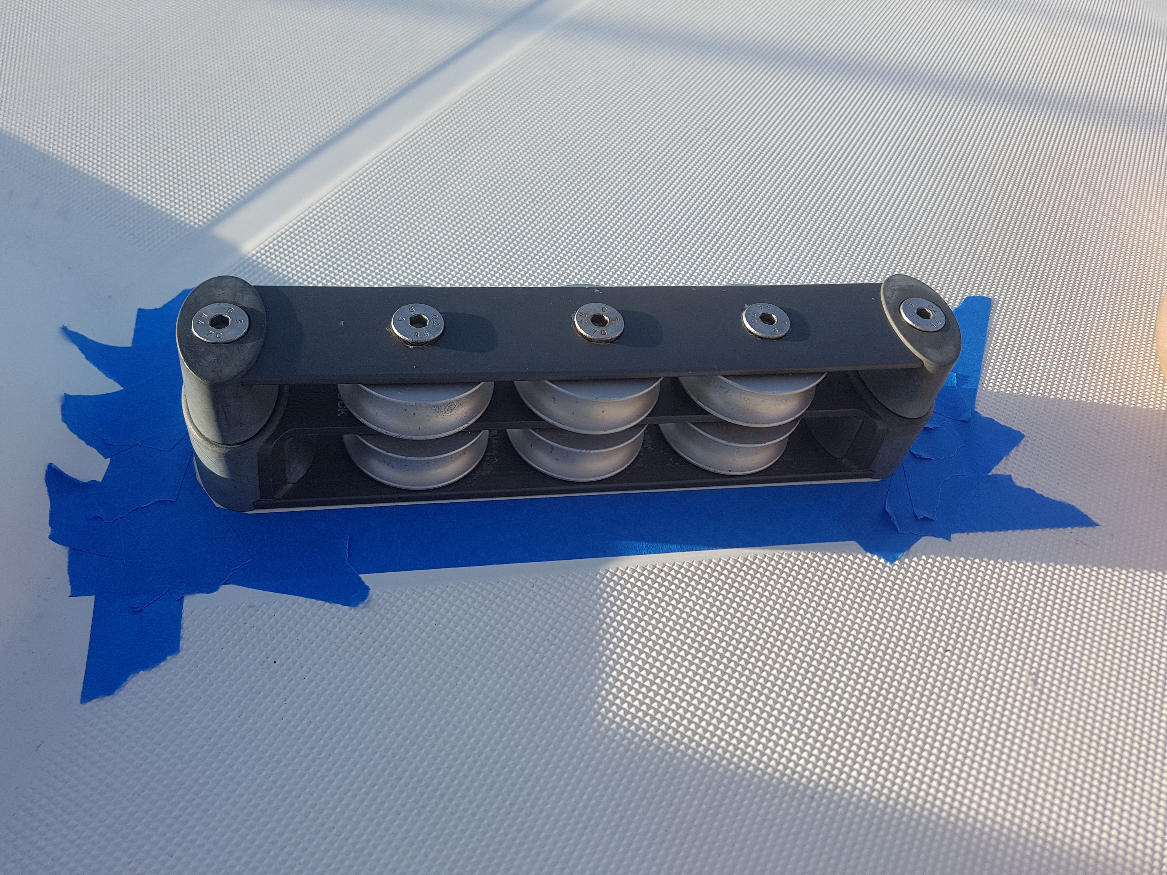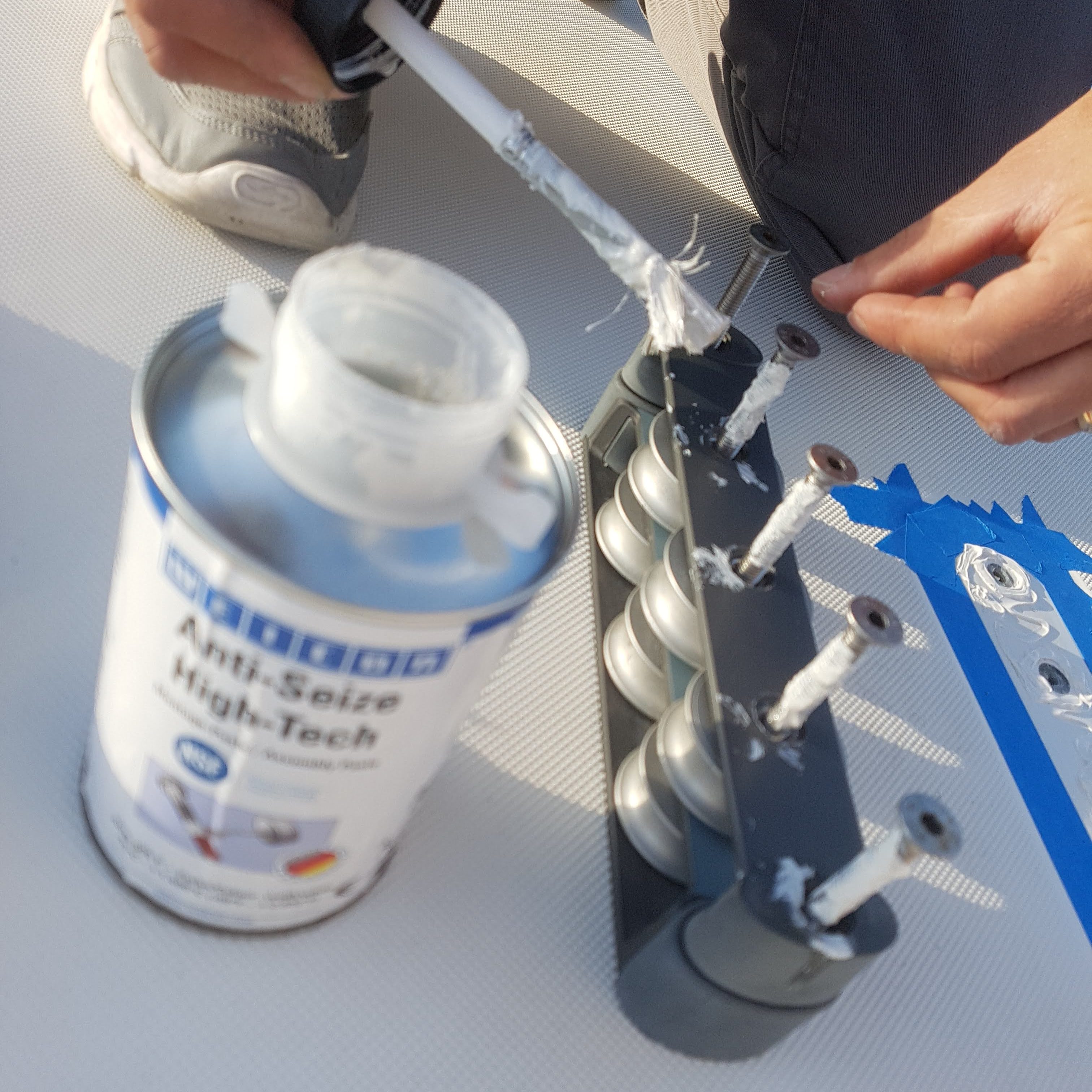 Then the real work could begin, first totally dismounting the deck organizer, bearings and all, cleaning them thoroughly in a petrol solution, and then bolting it back onto the roof of the catamaran.