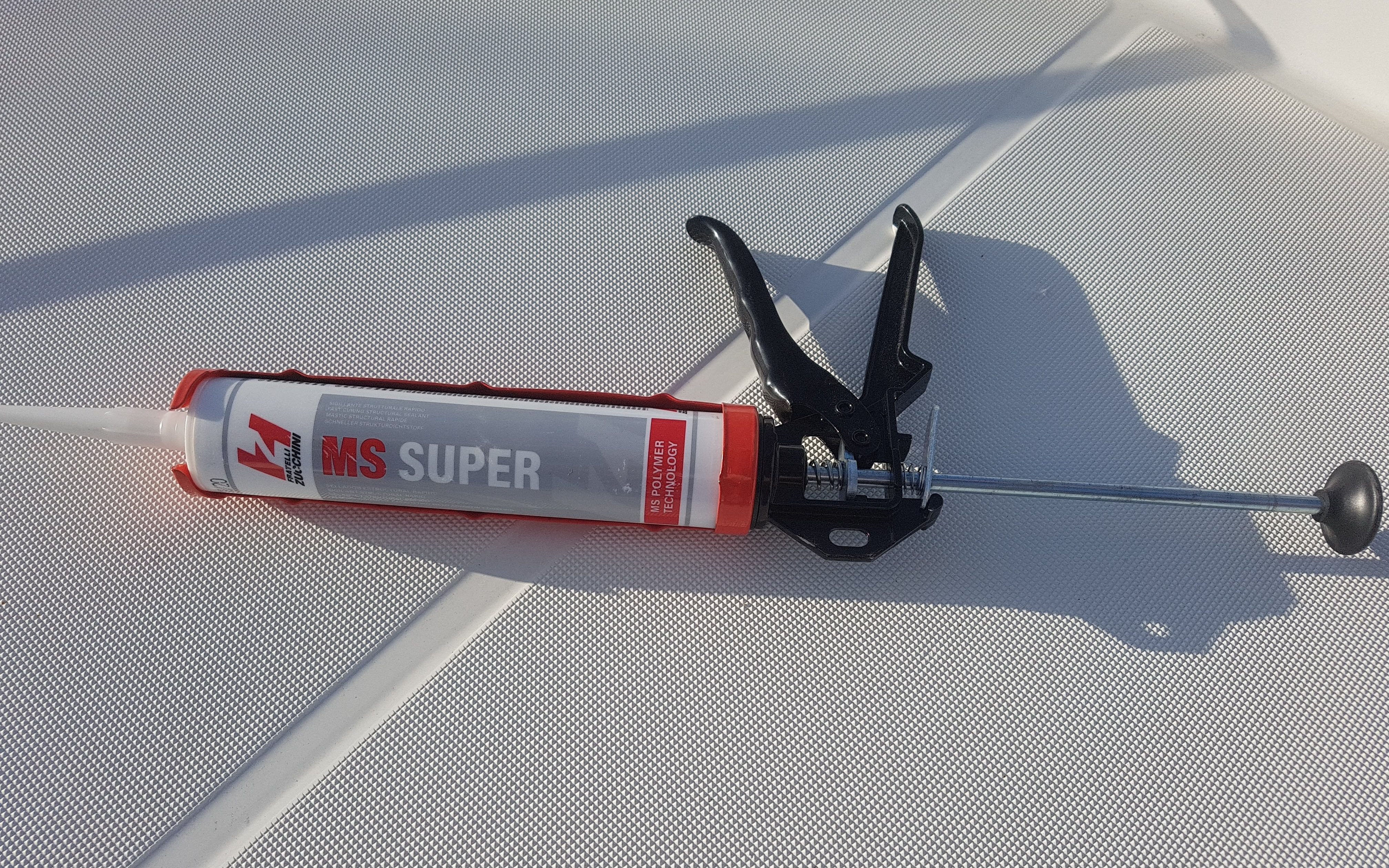 We don’t usually advertise the products we use, but in this instance we thought we would share the MS Superglue polymer from Fratelli Zucchini (“Permanent elasticity and flexibility combined with excellent adhesion to a great variety of surfaces and with a high cohesion make MS SUPER suitable for making high-performance seals and elastic joints. Reduced skin-forming time, rapid progression of the curing from the surface towards the inside of the joint and oven paintability at high temperatures make MS SUPER the ideal sealant for coachwork and metal construction.“)
