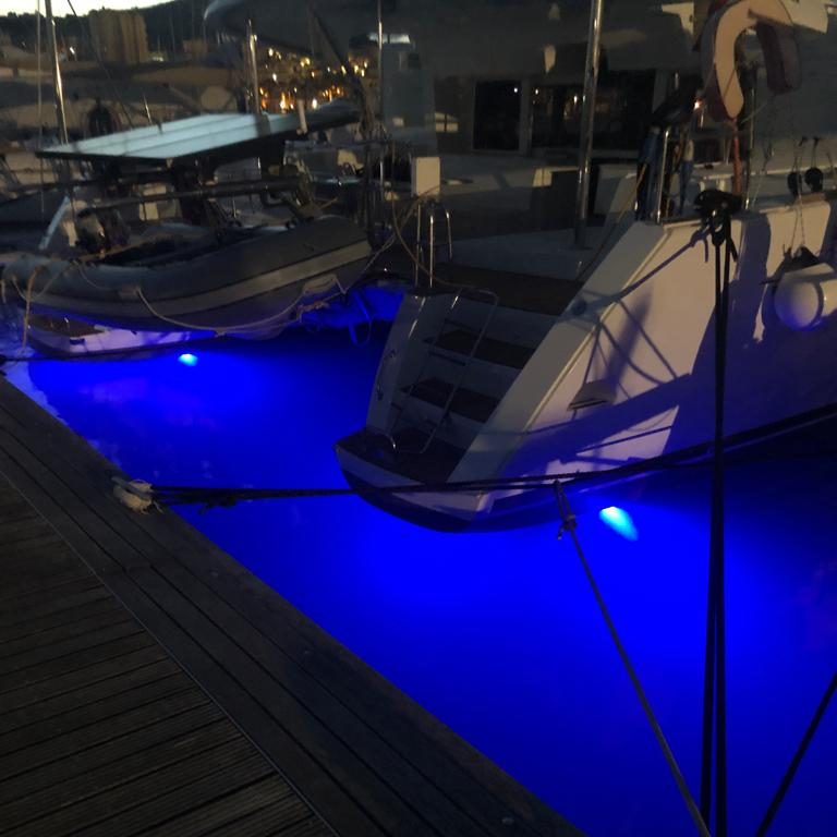 At the time, she was still on the hard, and we couldn’t share any photo of the finished job with the underwater lights. Now she’s back in the water, for a little time in Marina Cala del Sole, and the owner allowed us to make some photos so that we can share how it looks.