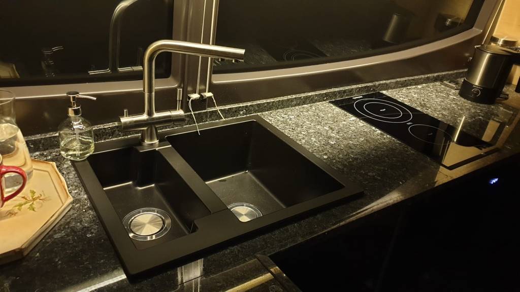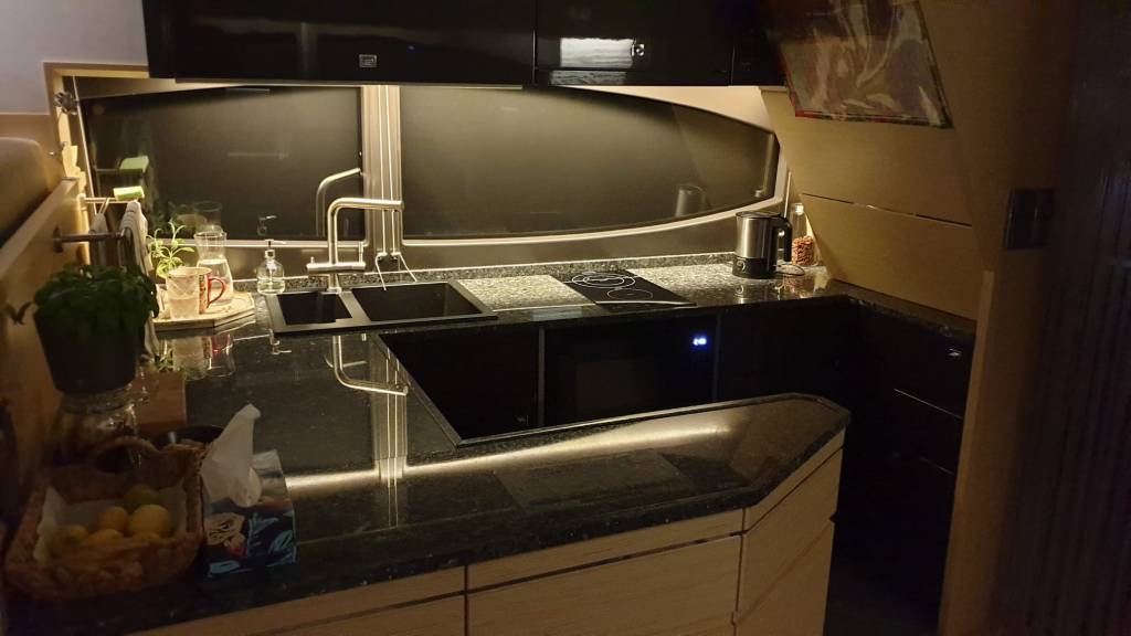 At night, the boat light system seem to highlight even better the beauty of this galley. Here, we can see how the sink fits perfectly with the counter-top style, also very practical with its two areas. The tap is a dual model, which allows a differentiation between drinking and standard water.