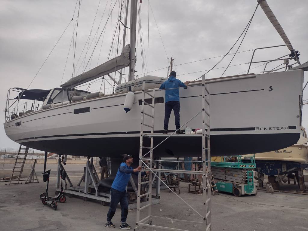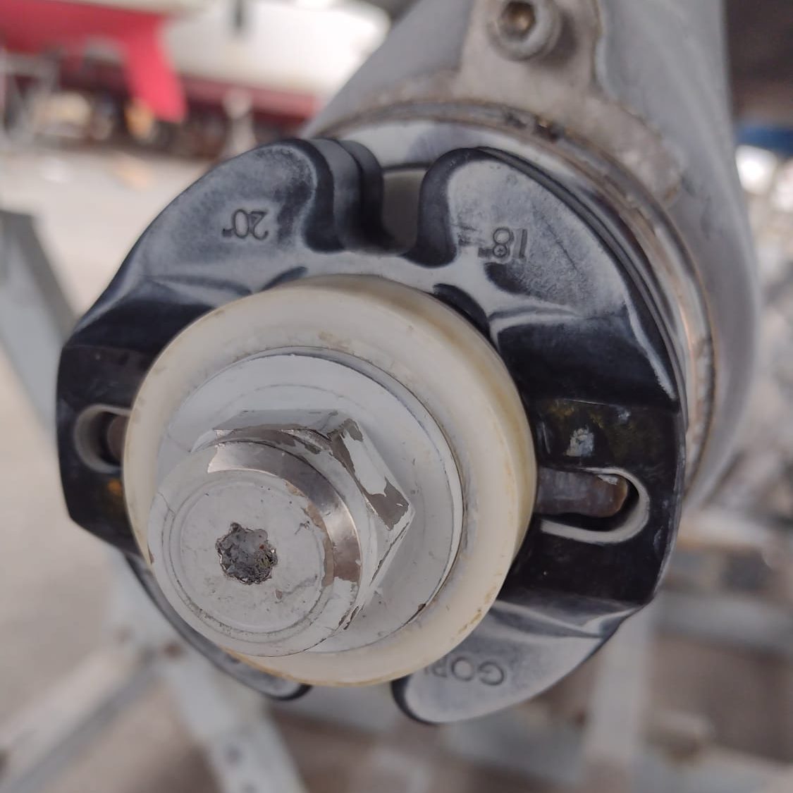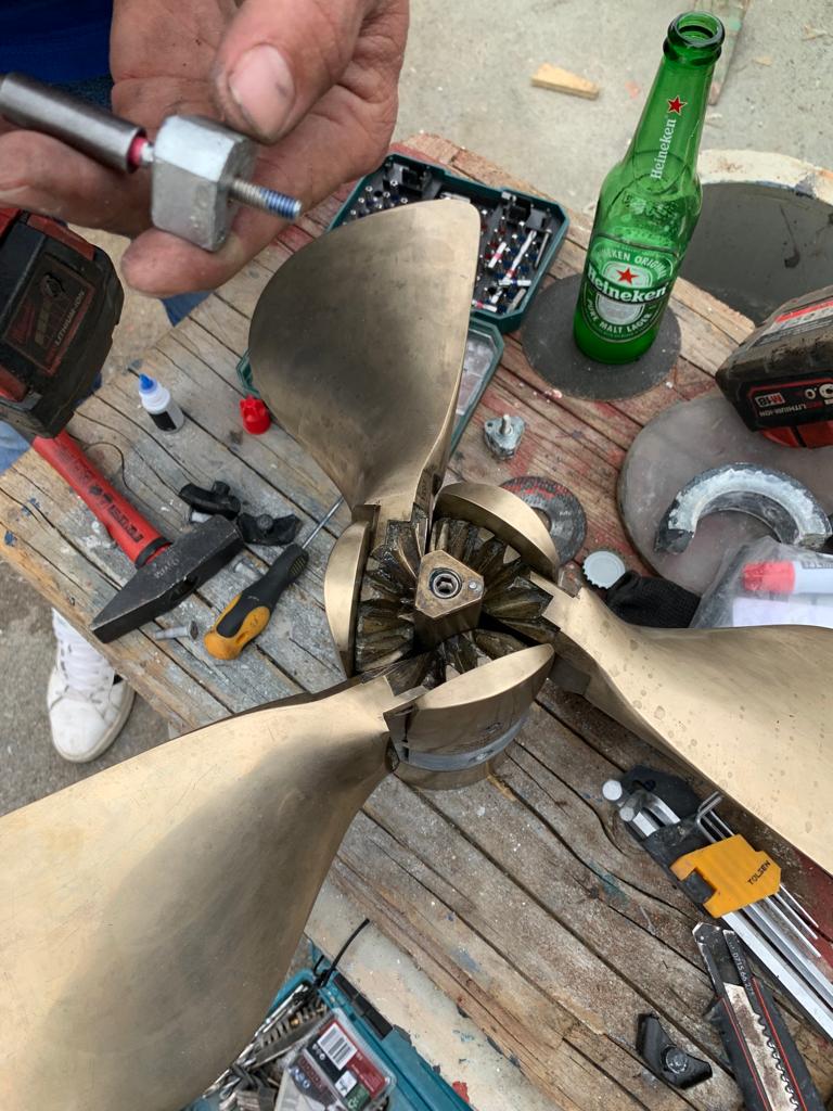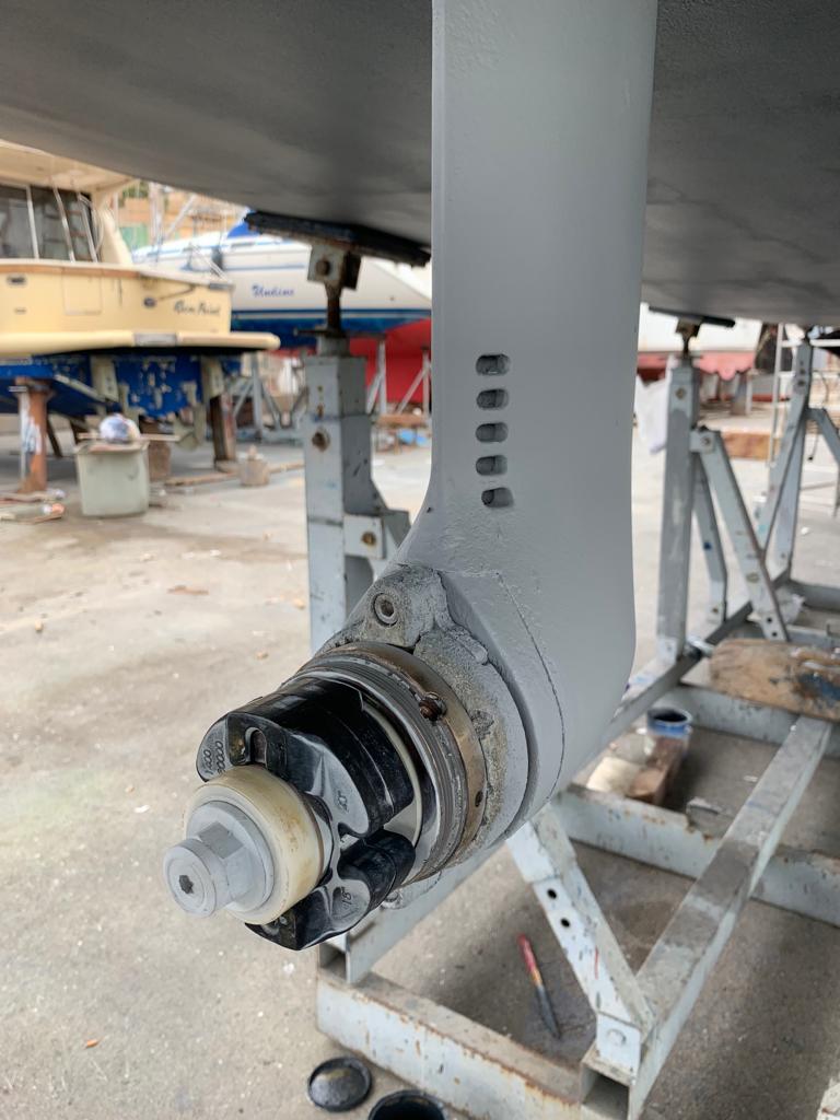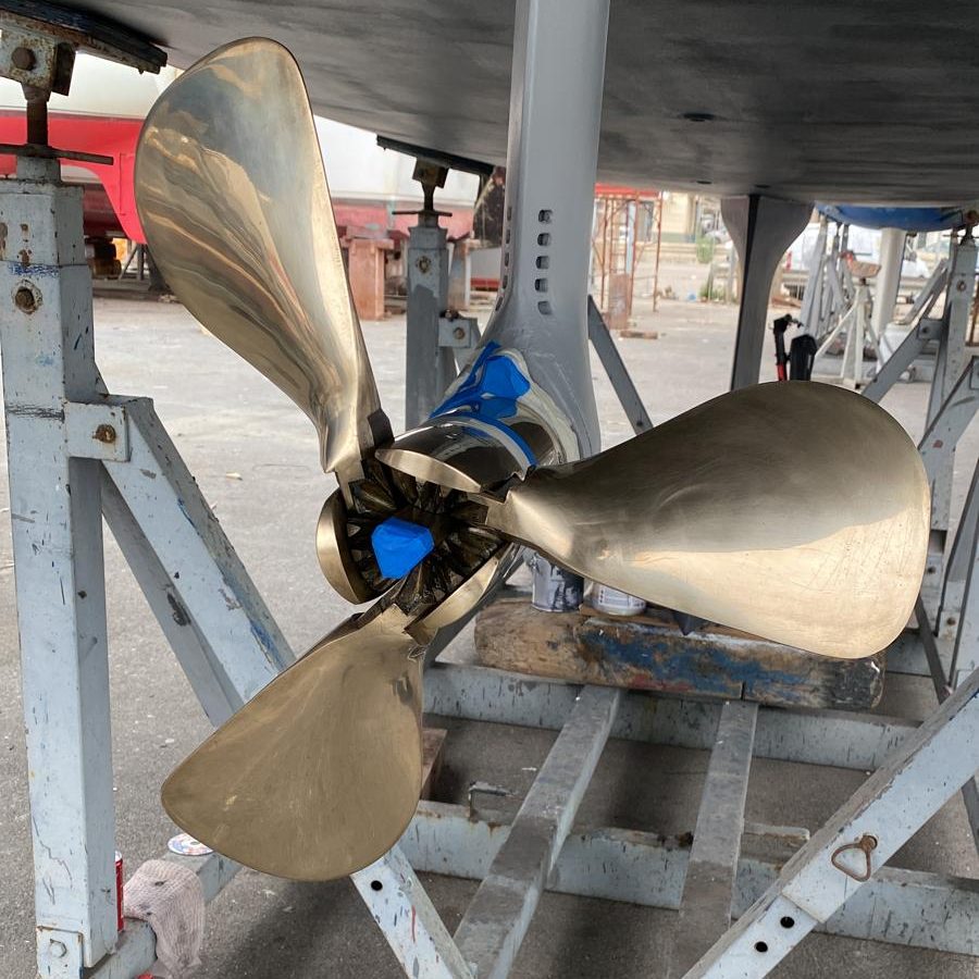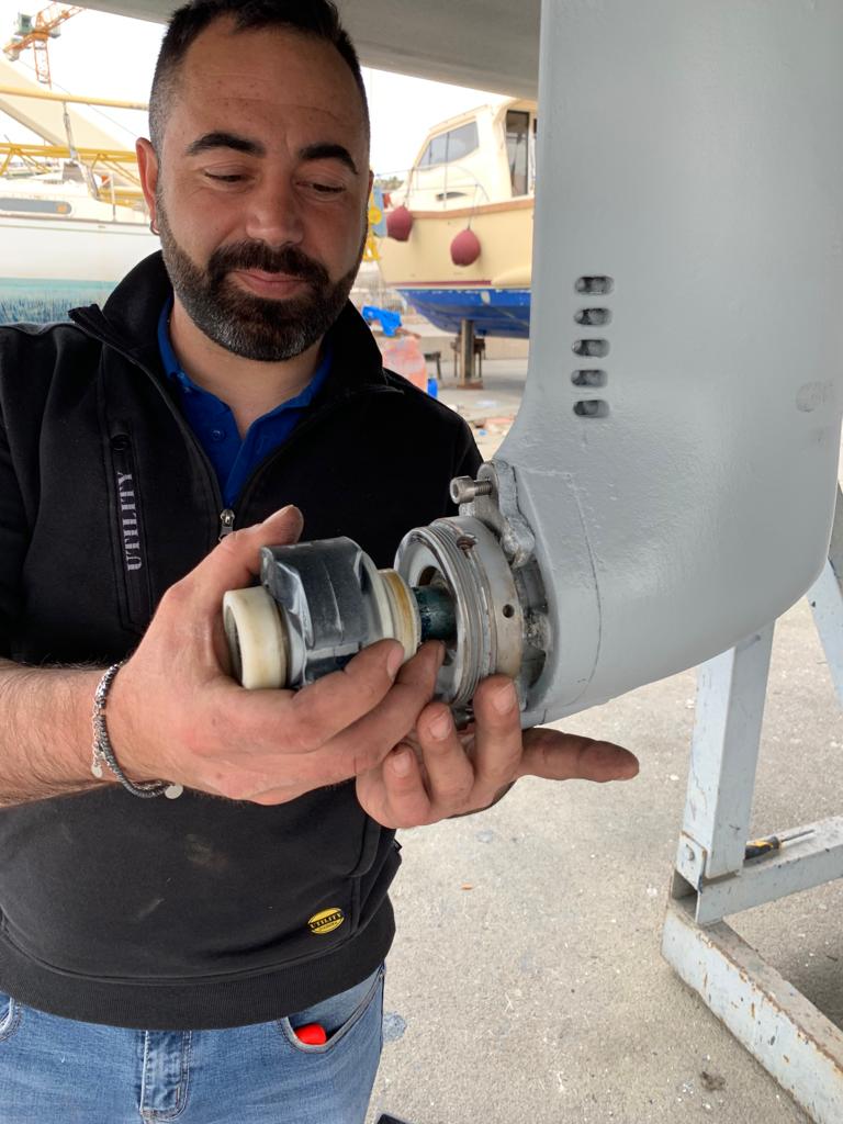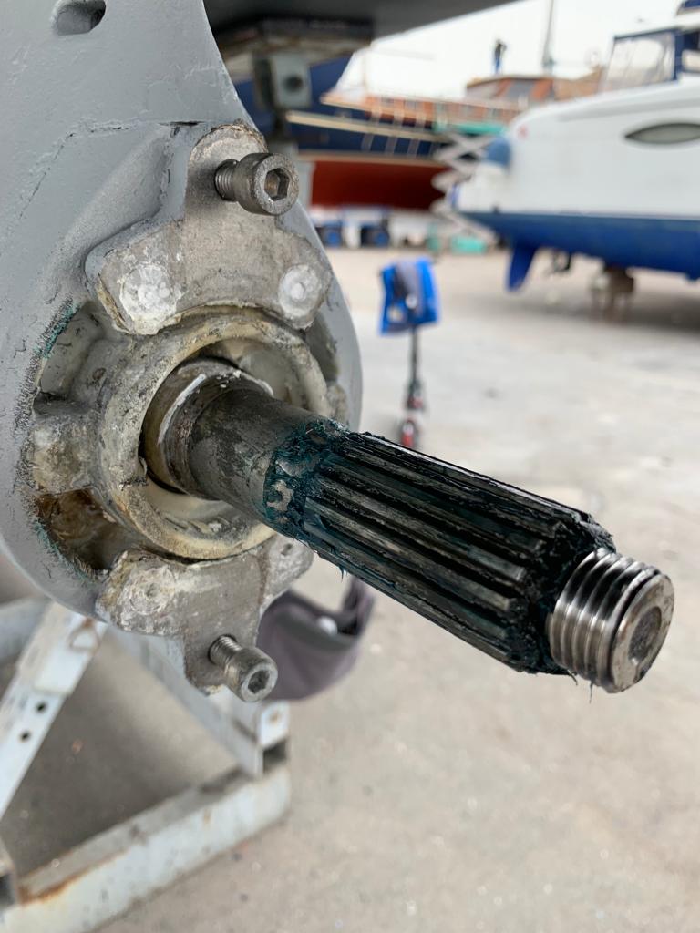 Last week, we took this Oceanis 45 out of the water to our yard, so that we could test the hull integrity vs. osmosis. Afterward, we got her ready for the sailing season and a planned journey to South America. In the process, we realized that the Gori propeller on this boat, not one we get to see very often, was very lose, and we decided to change the bearings.