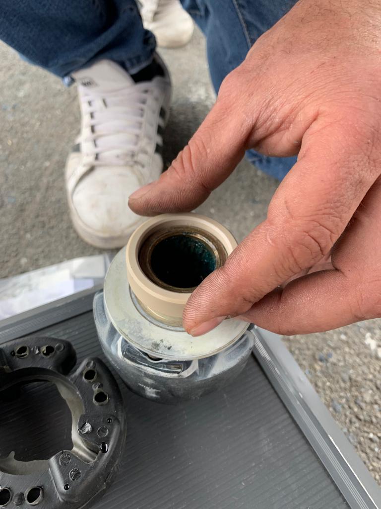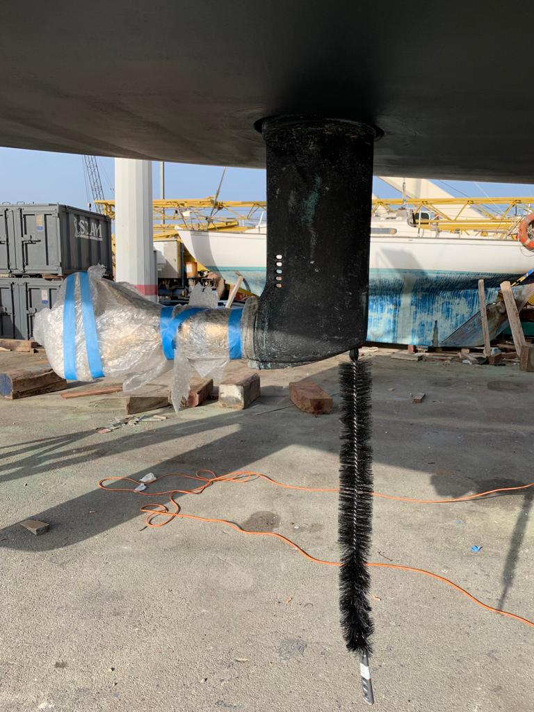 In the process of preparing the Sail Drive for its own treatment, we use a very long “bottle brush” to insure that the Sail drive is free of any organic troopers. And of course we fully cover the propeller so that the two products don’t mess one with the other.